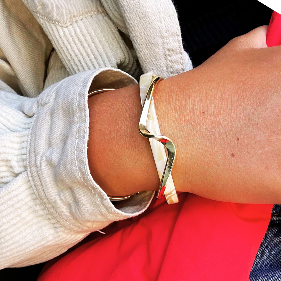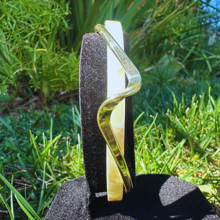 Indulge in the exquisite and unique beauty of our Shell Cuff. Adorn your wrist with this versatile and elegant piece, made from white shellfish and a bend metal bangle. Elevate any outfit with the timeless charm of this bracelet.